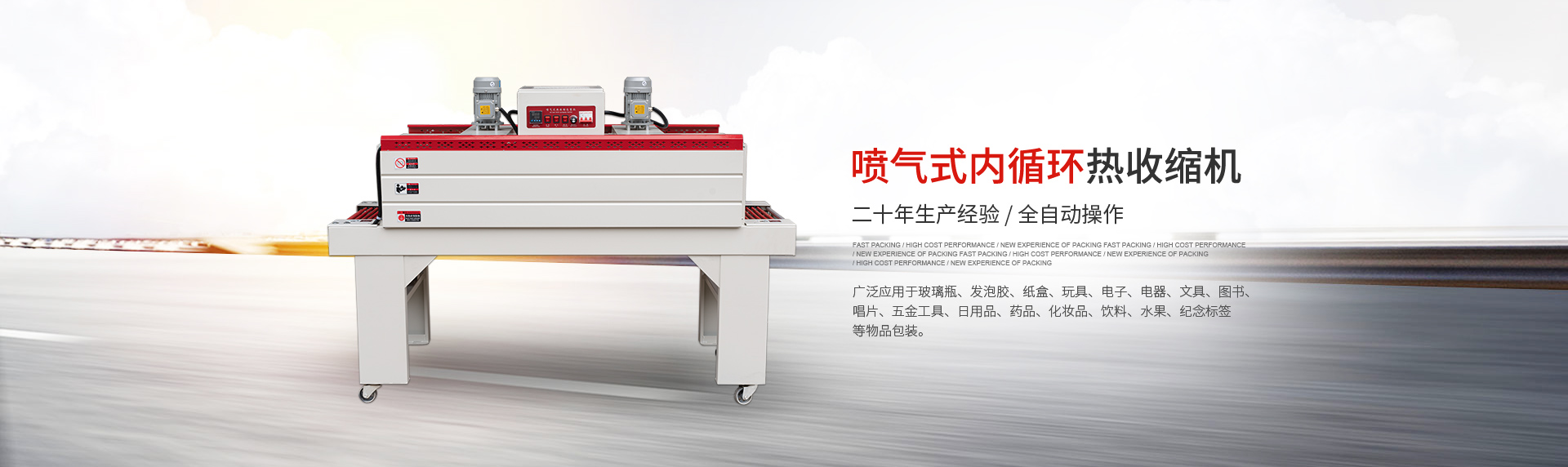 現主要產品有:全自動 L 型、邊封薄膜封切機、節(jié)能噴氣式內循環(huán)熱收縮機、貼體包裝機、吸塑包裝機、高周波塑膠熔接機、袖口式套膜機、枕式包裝機等多個系列的包裝機械